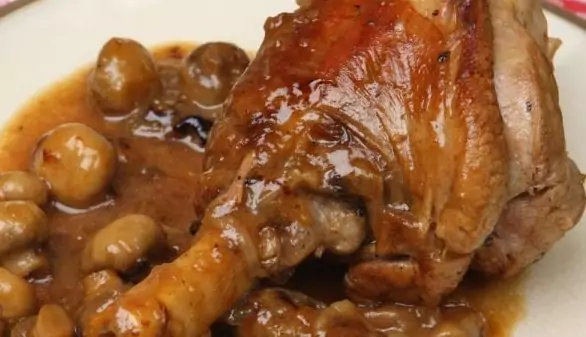 Обезкостявате бута и го почиствате от ципите и сухожилията. Заливате с 1 1/2 ч.ч. топла вода, посолявате, прибавяте 50 г масло, лютите чушки и няколко зърна черен пипер, захлупвате плътно съда и задушавате на слаб огън до омекване на месото.