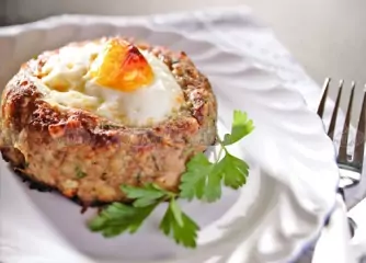 Смесете каймата с подправките и ситно нарязания магданоз и я объркайте хубаво. След това я разделете на 4 равни части. Всяка една част оформете като птиче гнездо, като за целта може да използвате и дъното на малка чаша.
