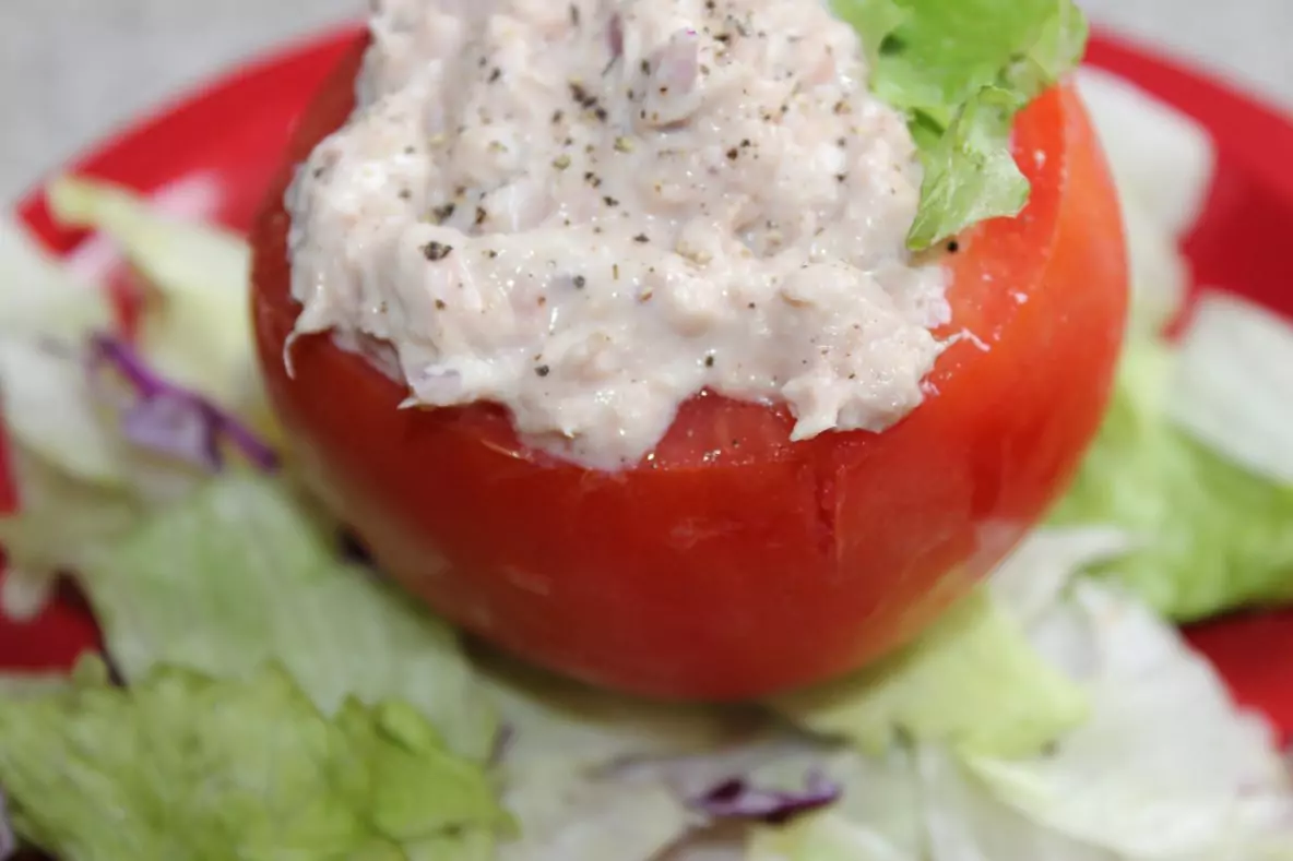 С шприц или лъжичка напълнете сместа в доматите и украсете с ивици маруля.