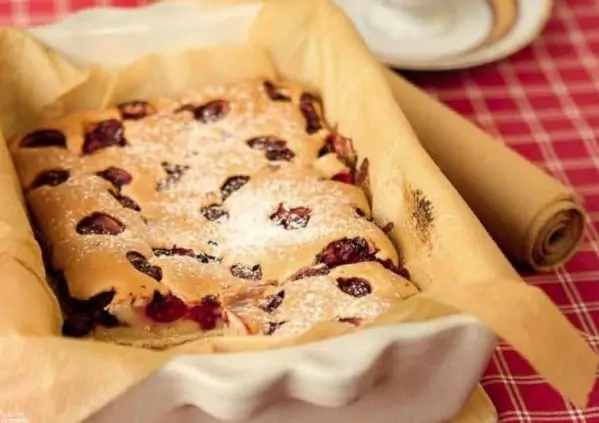Добавете 1/2 кг череши, без костилки. Застелете подходяща тавичка с хартия за печене, подмажете я с разтопено масло и изсипете сместа.