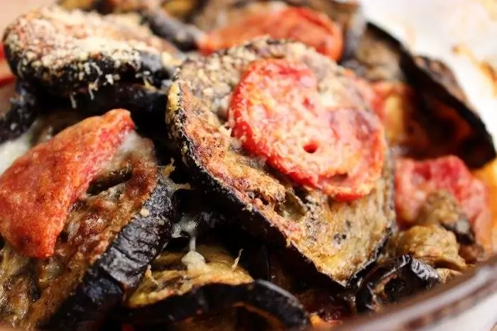 В огнеупорен съд смесваме доматите, патладжаните, чесъна и останалия зехтин. Подправяме леко със сол и черен пипер, поръсваме с пармезан и печем отново на 200 градуса за около 20 минути. Сервира се веднага.