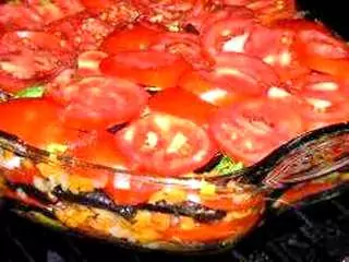 В тавичка се подреждат патладжаните, а върху тях се изсипва сместа от лука и чушките. Отгоре се нареждат нарязаните на филии домати.