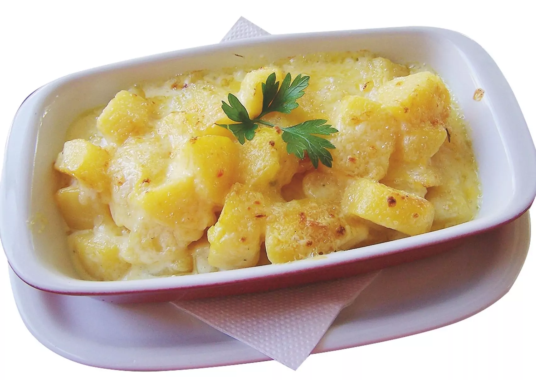 Така приготвените картофи, изсипете в йенска тавичка, гювече или огнеупорни чинии - по ваш избор. Изсипете сметаната. Прибавете парченца топеното сирене, моцарелата на тънки филийки и накрая настържете кашкавала.