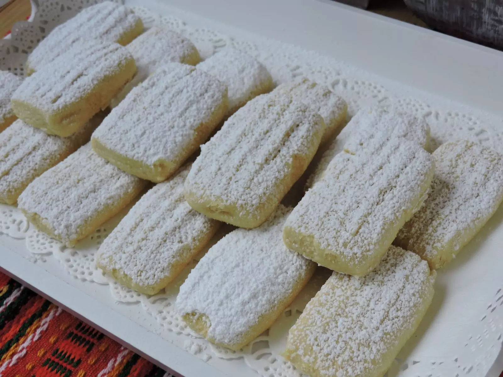 Добавете пресято брашно и замесете меко тесто. Разделете го на 4 части. От всяка оформяте фитил, леко го сплесквате и режете на 4-5 см. Върху всяко парче правите отпечатък с вилица и редите в тава с хартия.