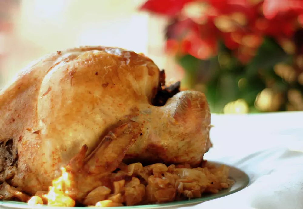 Залейте сместа с топла вода и оставете да ври около 10 минути до пълното омекване на зелето. Напълнете кокошката с получената плънка и я зашийте.