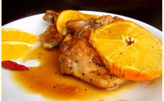 Сервира се с резенчета портокал, залети с горещия прецеден сос.