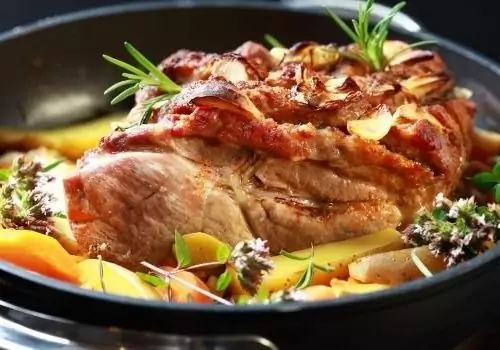 Пече се 70 - 80 мин. В порция се поднася месо, гарнирано с тиквени кубчета.