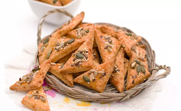 Подредете вашите триъгълничета на не голямо разстояние едно от друга в тава застлана с хартия за печене. Разбийте белтъка и намажете с помощта на четка соленките. Поръсете със семена.