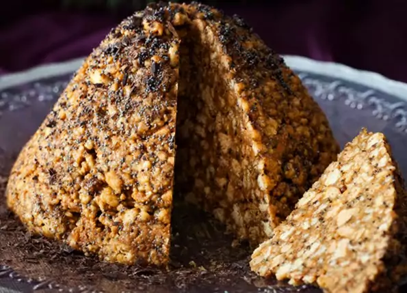 Прехвърлете сместа върху тортено плато и я оформете с ръце като купол на мравуняк. Отгоре украсете с ядки, мак и сусам. Сложете тортата за минимум 4 часа в хладилника.