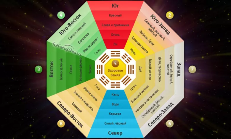 Таблицата в по-долу е опростена схема на ба-гуа. Използва се във фенг шуй, за да се определи всяка част от дома или офиса ви, към коя част от живота ви се отнася. Когато се научите да използвате схемата, ще ви бъде лесно да променяте някой части от пространството около себе си, за да постигнете мечтаното щастие и благополучие.