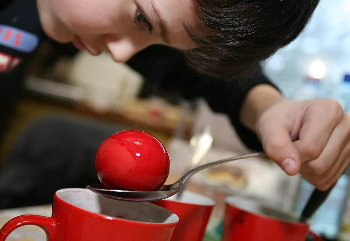 Първото боядисано яйце е задължително червено и се вярва че то притежава магическа сила. С него се търкат бузите на децата, за да са здрави и румени. В някои области на страната то се запазва до Великия четвъртък на следващата година и по състоянието на вътрешността му се гадае, а по други места има обичай да се заравя в нивата на Гергьовден, за да я пази от градушка.