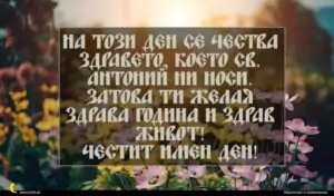 януари 14, 2021 Антоновден Пожелание за Антоновден 2 за 30 януари 2026 На този ден се чества здравето, което Св. Антоний ни носи. Затова ти желая здрава година и здрав живот! Честит имен ден!