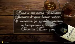януари 1, 2021 Васильовден Пожелание за Васильовден 1 за 30 януари 2026 Нека и ти като Василий Велики бъдеш велик човек! С желания за здраве, щастие и вътрешно щастие! Честит Имен ден!