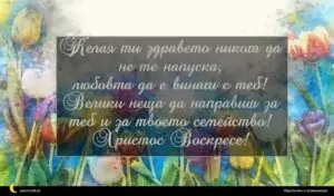 април 1, 2020 Великден Пожелание за Великден 56 за 30 януари 2026 Желая ти здравето никога да не те напуска, любовта да е винаги с теб! Велики неща да направиш за теб и за твоето семейство! Христос Воскресе!