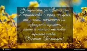 април 1, 2020 Великден Пожелание за Великден 65 за 30 януари 2026 Усещането за Великден не приключва с края на деня, то е само началото на идващата пролет, лято и начало на нови приятелства. Честит Великден!