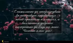 С пожелание да отпразнуваш Димитровден подобаващо – с много приятели и алкохол, а веселието и доброто настроение да бъде на макс.