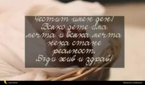 март 7, 2020 Имен ден на дете Пожелание за Имен ден на дете 15 за 29 януари 2026 Честит имен ден! Всяко дете има мечта и всяка мечта нека стане реалност. Бъди жив и здрав!