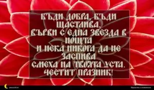 февруари 8, 2020 Имен ден на жена Пожелание за имен ден на жени 10 за 29 януари 2026 Бъди добра, бъди щастлива, върви с една звезда в нощта и нека никога да не заспива смеха на твоята уста. Честит празник!
