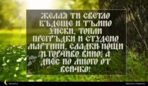 февруари 3, 2020 Имен ден Пожелание за Имен Ден 22 за 29 януари 2026 Желая ти светло бъдеще и тъмно уиски, топли прегръдки и студено мартини, сладки нощи и горчиво вино, а днес по много от всичко!