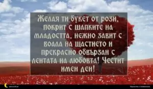 февруари 3, 2020 Имен ден Пожелание за Имен Ден 39 за 29 януари 2026 Желая ти букет от рози, покрит с шапките на младостта, нежно завит с воала на щастието и прекрасно обвързан с лентата на любовта! Честит имен ден!