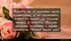 февруари 3, 2020 Имен ден Пожелание за Имен Ден 83 за 29 януари 2026 Живота не се измерва броя вдишвания, а по спомените, които те карат да гледаш напред в живота. Желая хубави моменти с верни приятели. Честит имен ден!