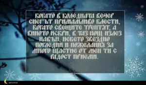 ноември 29, 2020 Коледа Пожелание за Коледа 105 за 30 януари 2026 Когато в Коледната вечер снегът примамливо блести, когато свещите трептят, а виното искри, в таз нощ излез навън, небето звездно погледни и пожелания за много щастие от мен ти с радост приеми.