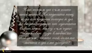ноември 29, 2020 Коледа Пожелание за Коледа 33 за 30 януари 2026 Как искам да съм като ангелите в Коледната нощ и да погледнеш нагоре и да ме видиш озарен от лунната светлина, но аз съм един обикновен лудо влюбен по теб мъж, чиято най-голяма мечта е да сме заедно!