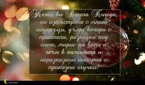 ноември 29, 2020 Коледа Пожелание за Коледа 42 за 30 януари 2026 Желая ви Весела Коледа, но изпъстрена с много подаръци, дълги вечери с приятели, разходки под снега, мирис на вино и огън в камината и неразказани истории с приказни случки!