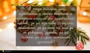 ноември 29, 2020 Коледа Пожелание за Коледа 8 за 30 януари 2026 В тази коледна нощ, изпълнена с много топлина и приятни емоции ти пожелавам: любов, за да изпълва сърцето, приятели, за да има на кой да се довериш, здраве, за да можеш да бъдеш истински щастлив!