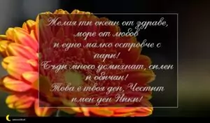 ноември 29, 2020 Никулден Пожелание за Никулден 9 за 30 януари 2026 Желая ти океан от здраве, море от любов и едно малко островче с пари! Бъди много усмихнат, силен и обичан! Това е твоя ден, Честит имен ден Ники!