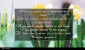 октомври 13, 2020 Петковден Пожелание за Петковден 46 за 30 януари 2026 Работи, сякаш не се нуждаеш от пари. Обичай, сякаш никой никога не те е наранявал. Танцувай, сякаш никой не те гледа. Пей, сякаш никой не те слуша. Живей така, сякаш на земята е рай! Честит празник!
