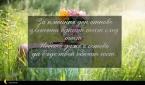 октомври 13, 2020 Петковден Пожелание за Петковден 77 за 30 януари 2026 За именния ден отново цветята вдигат тост след тост. Небето даже е готово да бъде твой обичан гост.