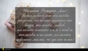 Честит Рожден Ден! Пожелавам ти толкова радост, колкото когато те видя, толкова любов, колкото когато съм с теб и толкова късмет, колкото твоята мама, че да те има!
