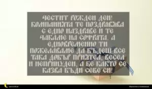 Компанията те поздравява с едно наздраве и те чакаме на софрата. А едновременно ти пожелаваме да бъдеш все така добър приятел, весел и непринуден, а бе както се казва бъди себе си!