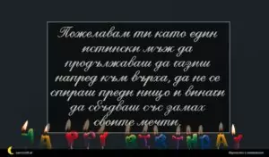 Пожелавам ти като един истински мъж да продължаваш да газиш напред към върха, да не се спираш преди нищо и винаги да сбъдваш със замах своите мечти.