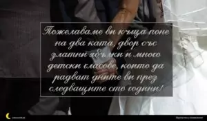 март 9, 2020 Сватба Пожелание за Сватба 19 за 30 януари 2026 Пожелаваме ви къща поне на два ката, двор със златни ябълки и много детски гласове, които да радват дните ви през следващите сто години!