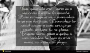 Сега щастливи сте – личи си и радостта в очите ви прелива. Няма капчица тъга – пожелавам ви да сте все така. Пожелавам ви любов голяма и само слънце да огрява, живота ви на двама. Бъдете силни, умни и добри и нека любовта ви води по път нелек, но осеян със звезди.