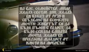 март 9, 2020 Сватба Пожелание за Сватба 51 за 30 януари 2026 На вас, семейство, мило, желая светли дни, желая ви букет от рози и сбъдване на всичките мечти! Животът ви да бъде пълен с радост, да бъде свидна вашата мечта, желая ви прекрасна младост от името на ЛЮБОВТА!