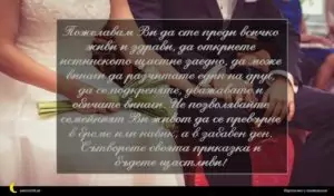 Пожелавам Ви да сте преди всичко живи и здрави, да откриете истинското щастие заедно, да може винаги да разчитате един на друг, да се подкрепяте, уважавате и обичате винаги. Не позволявайте семейният Ви живот да се превърне в бреме или навик, а в забавен ден. Сътворете своята приказка и бъдете щастливи!