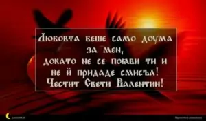 февруари 6, 2020 Св. Валентин Пожелание за свети Валентин 27 за 30 януари 2026 Любовта беше само дума за мен, докато не се появи ти и не й придаде смисъл! Честит Свети Валентин!
