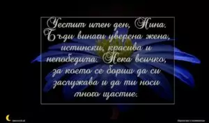 януари 14, 2021 св. Нина Пожелание за св. Нина 4 за 30 януари 2026 Честит имен ден, Нина. Бъди винаги уверена жена, истински, красива и непобедима. Нека всичко, за което се бориш да си заслужава и да ти носи много щастие.