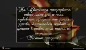 март 8, 2020 Цветница Пожелание за Цветница 10 за 30 януари 2026 На Цветница празнуваме твоя имен ден и нека хубавият празник ти донесе здраве, благословен живот и успехи в това, към което се стремиш. Честит празник!