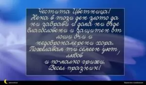 март 8, 2020 Цветница Пожелание за Цветница 2 за 30 януари 2026 Честита Цветница! Нека в този ден злото да ни забрави и дома ни бъде благословени и защитен от лоши очи и недобронамерени хора. Пожелавам ти семеен уют, любов и по-малко грижи. Весел празник!