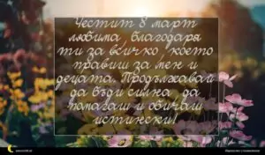 март 2, 2020 8 март Пожелание за 8 март 1 за 30 януари 2026 Честит 8 март любима, благодаря ти за всичко, което правиш за мен и децата. Продължавай да бъди силна, да помагаш и обичаш истински!