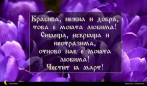 март 2, 2020 8 март Пожелание за 8 март 2 за 30 януари 2026 Красива, нежна и добра, това е моята любима! Сияеща, искряща и неотразима, отново пак е моята любима! Честит 8 март!