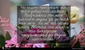 март 2, 2020 8 март Пожелание за 8 март 20 за 30 януари 2026 Честит празник на най-добрата майка! Получаваш от мен златен медал за успеха към мен, че ме направи човек. Обичам те мамо и ти благодаря, продължавай да бъдеш щастлива!