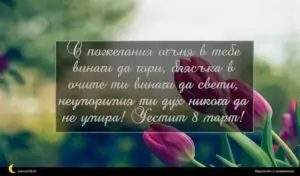 март 2, 2020 8 март Пожелание за 8 март 29 за 30 януари 2026 С пожелания огъня в тебе винаги да гори, блясъка в очите ти винаги да свети, неуморимия ти дух никога да не умира! Честит 8 март!