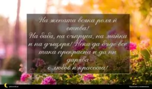 март 2, 2020 8 март Пожелание за 8 март 35 за 30 януари 2026 На жената всяка роля й отива! На баба, на съпруга, на майка и на дъщеря! Нека да бъде все така прекрасна и да ни дарява с любов и красота!