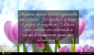март 2, 2020 8 март Пожелание за 8 март 38 за 30 януари 2026 Моята жена е най-красива на света! За това с цвете в ръка й казвам: “Мила моя, много те обичам и само в нежност днес те обличам”!