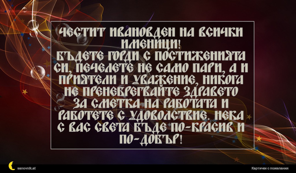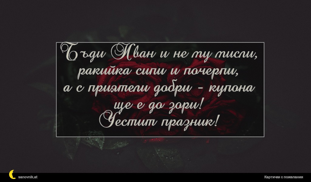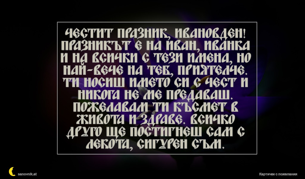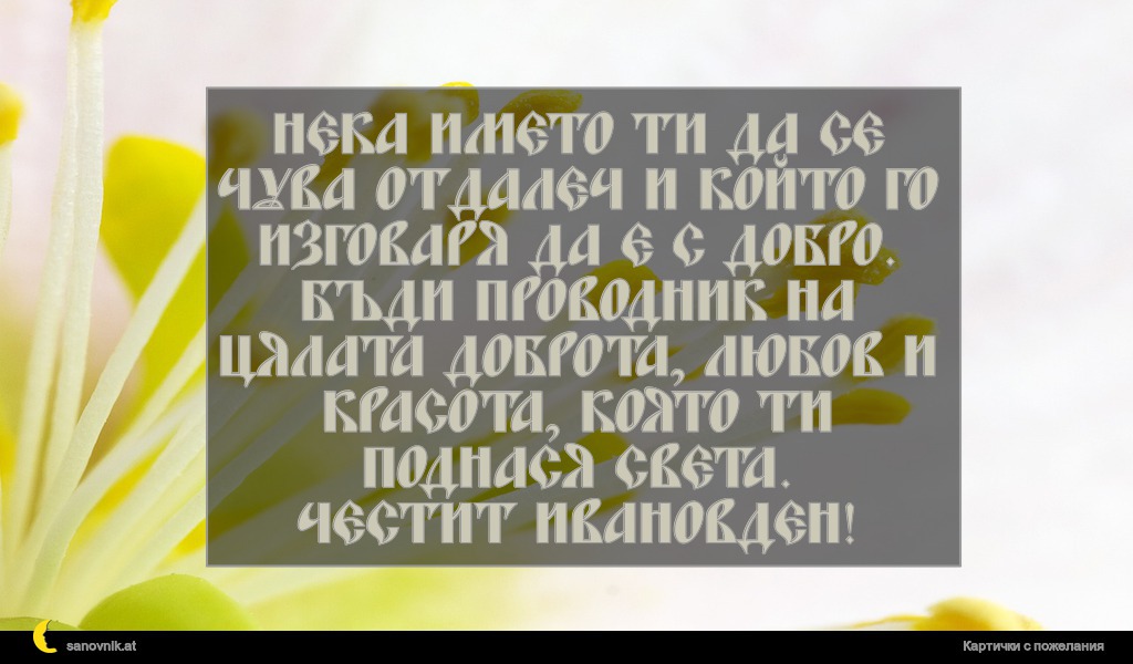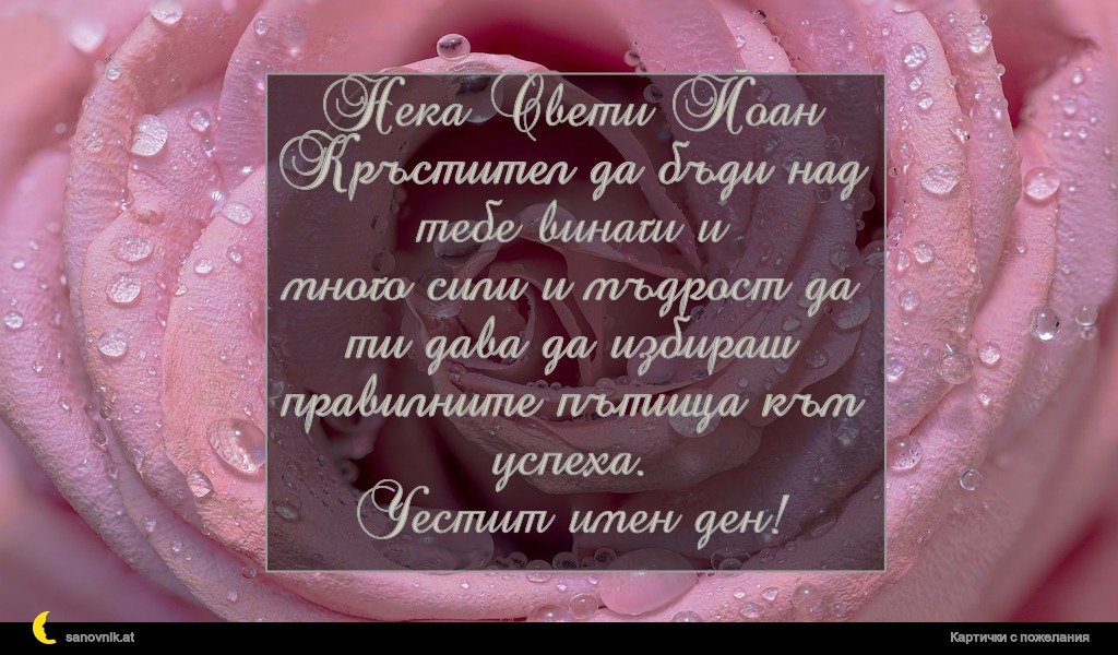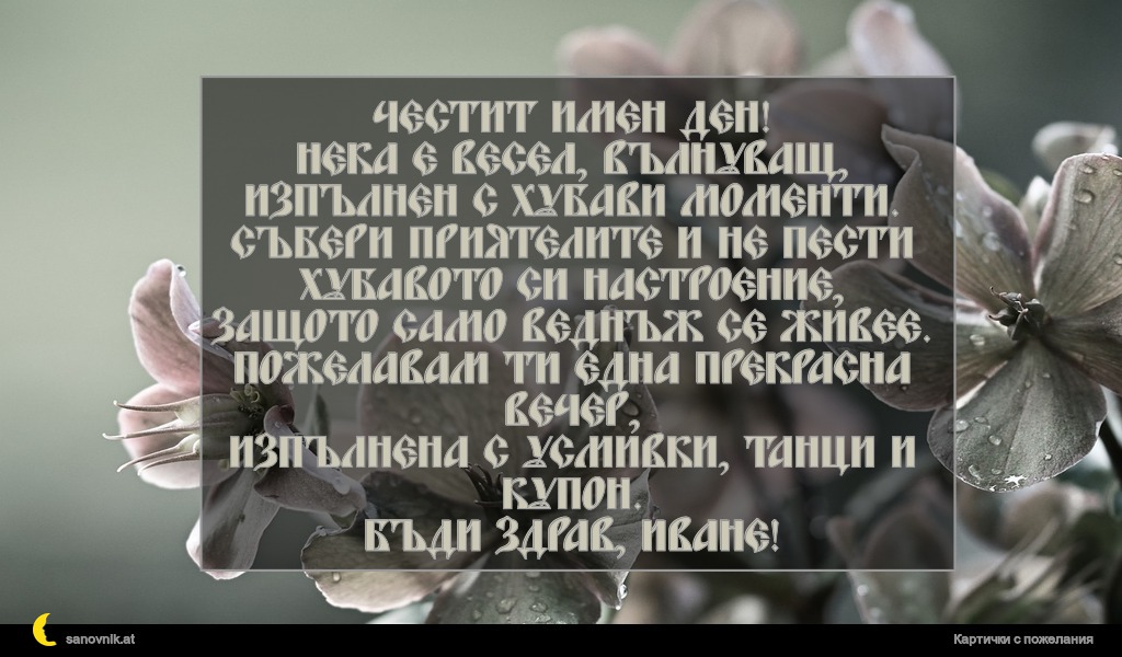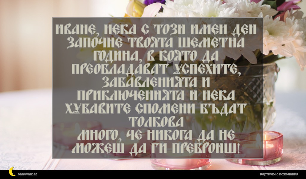 ВАНА, ВАНЯ, ВАНЬО, ВАНИНА, ЖАН, ЖАНА, ИВА, ИВАНА, ИВАНКА, ИВАЙЛА, ИВАЙЛО, ИВАН, ИВАНИНА, ИВАНИЧКА, ЙОН(А), ЙОНО, ЙОНКА, ЙОНКО, ЙОТО, ЙОТКО, ЙОТА, КАЛОЯН, КАЛОЯНА